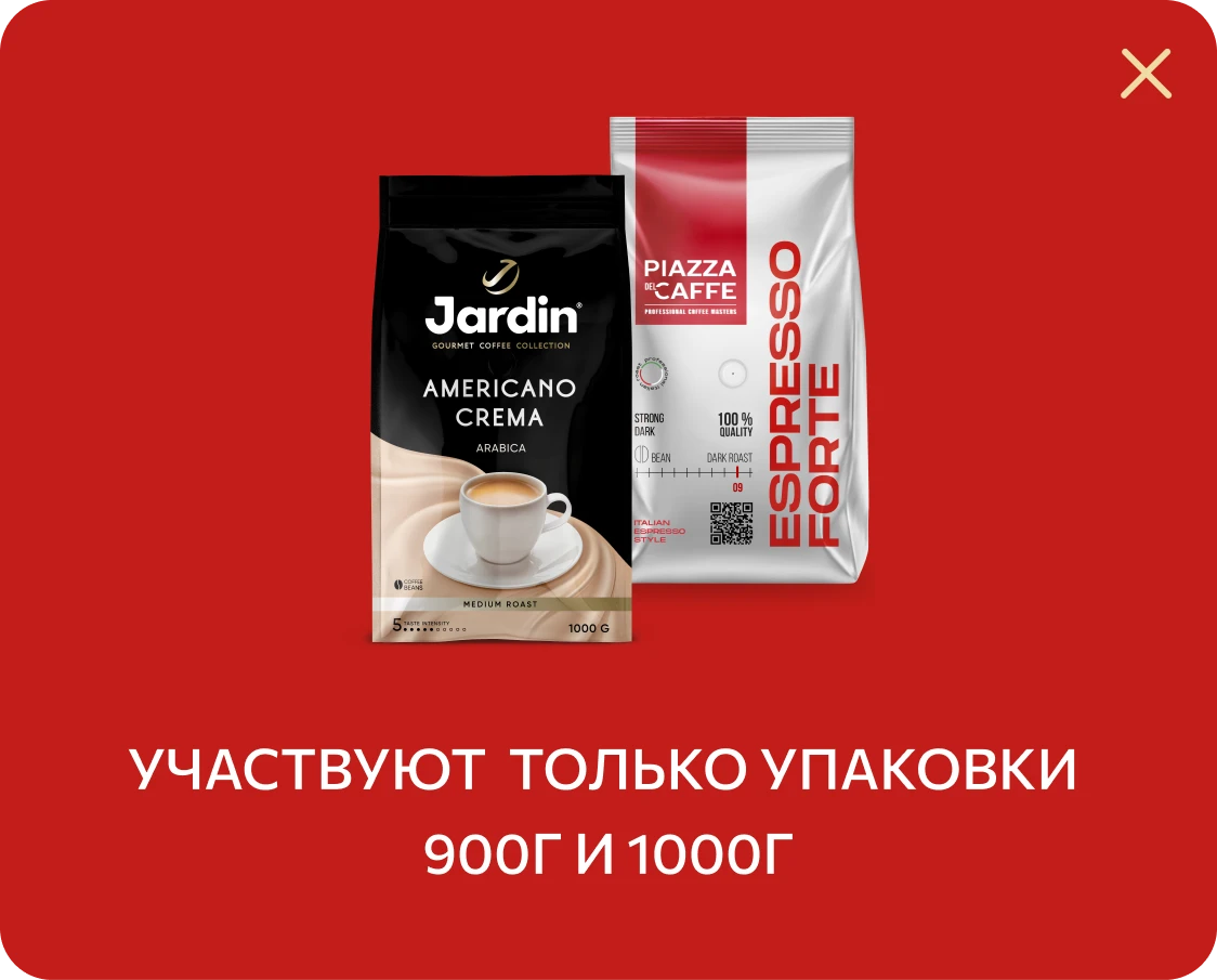 В Акции участвует зерновой кофе Jardin в упаковках 1 000 г. и зерновой кофе Piazza del Caffe в упаковках 900 г. и 1000 г.